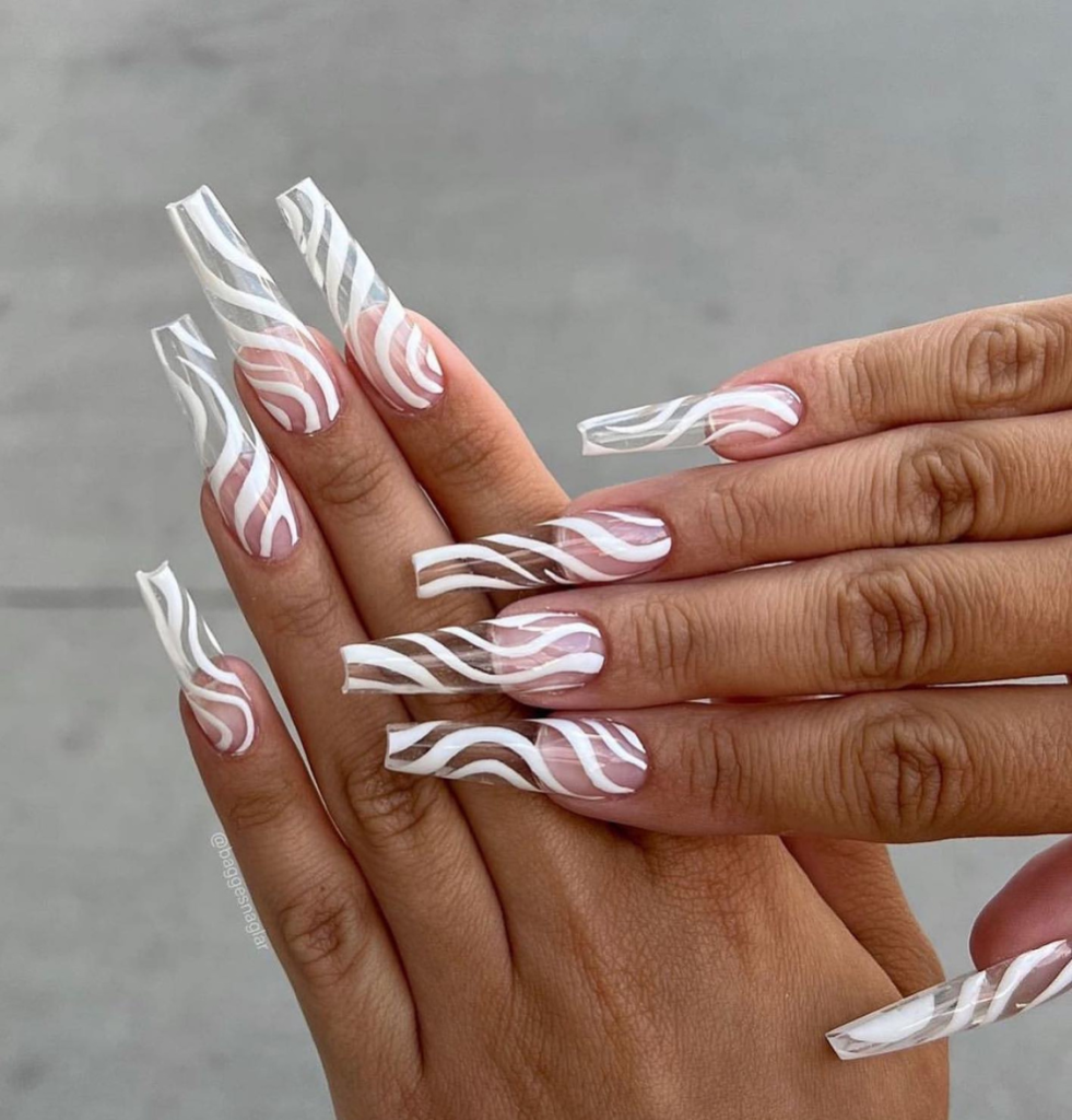 These white and pink long wavy acrylics are playful like twirls and twists of the summer breeze, and they are a true statement piece. The coffin length gives it drama, while the swirling line pattern creates a cute and hypnotic effect, perfect for summer nights. Just think about wearing these with a dressy billowy off-shoulder top and palazzo pants for an easy-to-pull-off chic outfit.