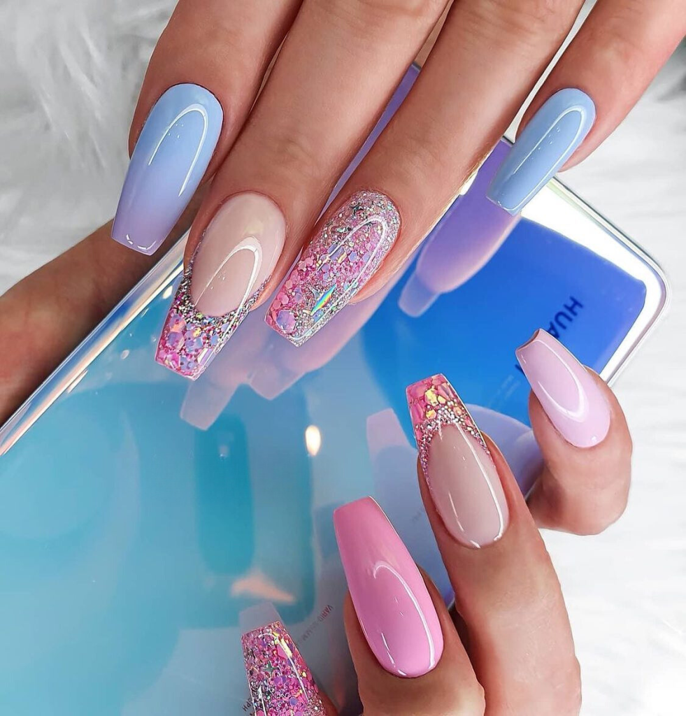 A dreamy pastel palette with a coffin short length that’s as sweet as summer ice cream is the primary design of this piece. The blue and pink shades featuring sparkling accents are a modern take on the traditional French tip, which in turn, these nails become an absolutely stylish addition to any summer event. Visualize them teaming up with a pastel clutch and strappy sandals for a full seasonal look.