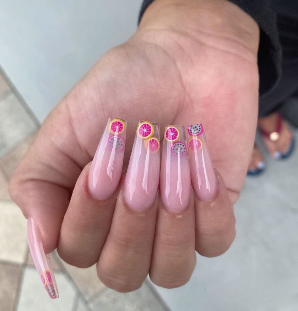 These short nails with the fresh fruit logos on a basic almond shape are a direct reference to the summer zesty side. They have a functionality-bearer and several summer days of fun association to tropical drinks. A brightly colored sundress or even a top in the same tones would match these cheerful nails perfectly.