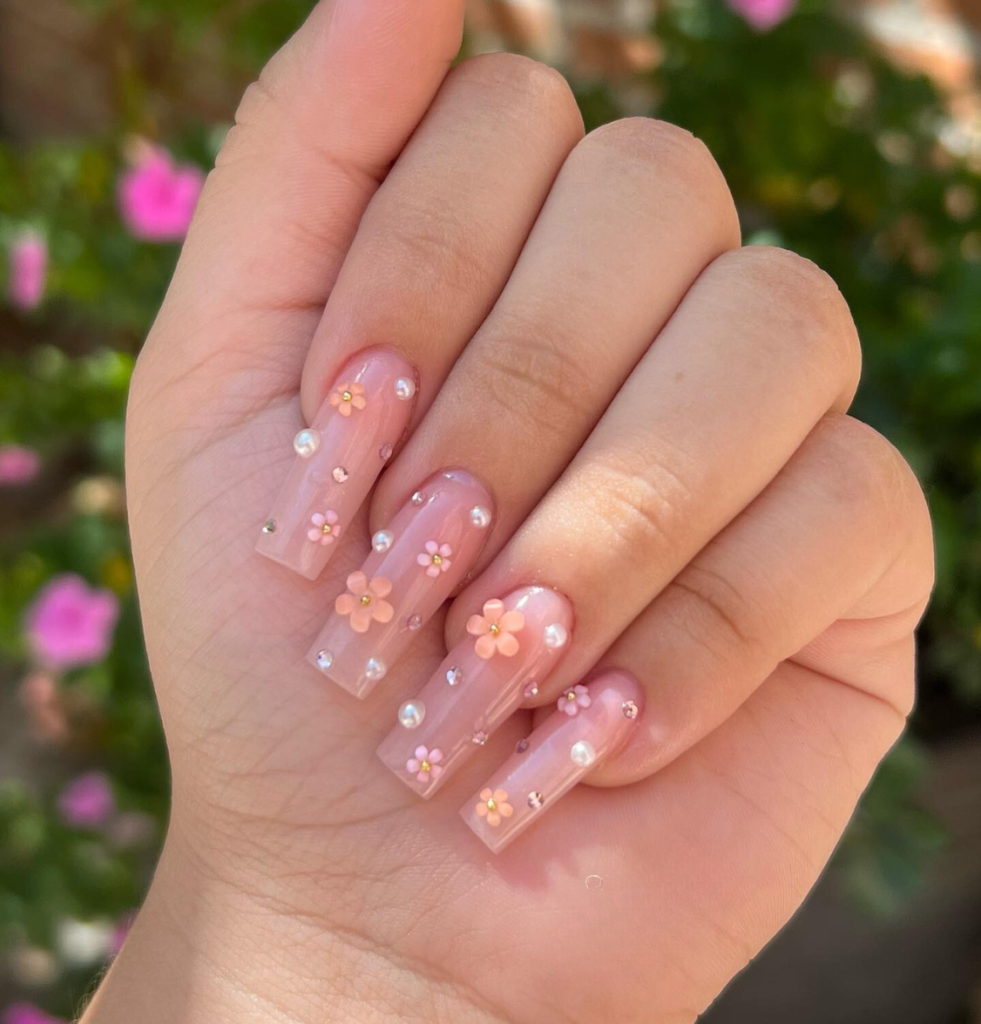 Let the serene loveliness of cherry blossoms captivate you with these short and clear acrylic nails that are highlighted by subtle pink floral ornaments and pearls. The chic style of such nails symbolizes the little happinesses of summer. The nails can be sweetly added to a summer wedding outfit or a tea party dress thus giving a touch of elegance.