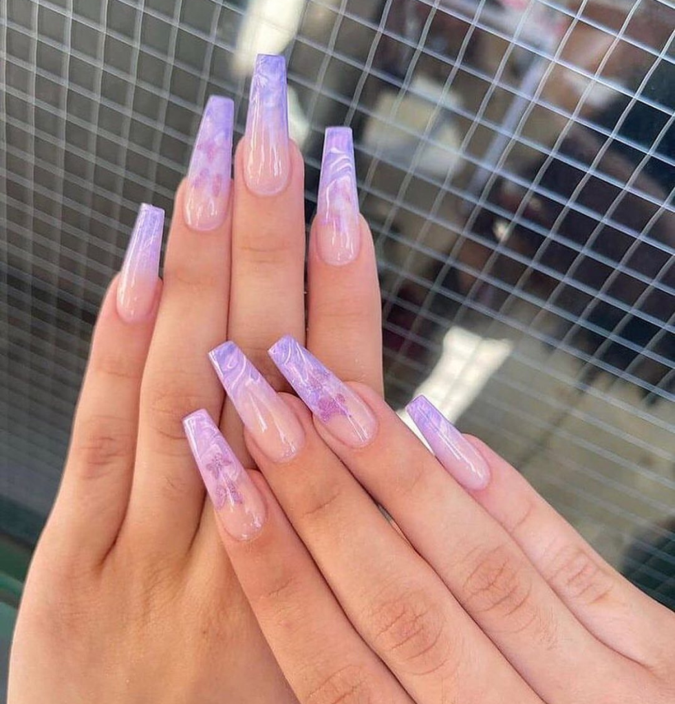 These coffin nail designs, featuring the purple swirls that are heavenly like the veins in amethyst, are actually the amethyst which eases one’s anxiety according to its ancient beliefs. In addition to the evening dress and business suit, a woman who has a mysterious aura could bring these nails to a party or an office to complete a perfectly elegant look and a touch of magic.