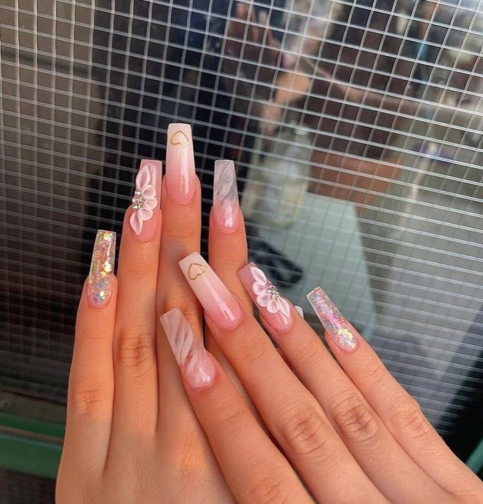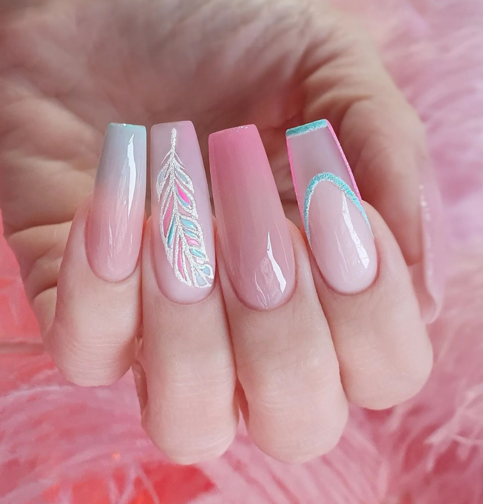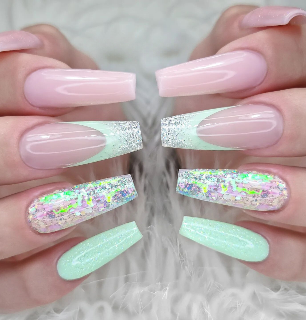 A sweet and stylish representation of spring, the nails have a combination of almond-shaped pink base and glistening glitter that adds a playful yet elegant effect to it. The minty accent nails introduce a summer breeze, they are just right for days when you want to dress up with a bit of ice. Hidden the possibility of imagining yourself at a summer party, enjoying a glass of sparkling rosé, these nails would be the perfect match.