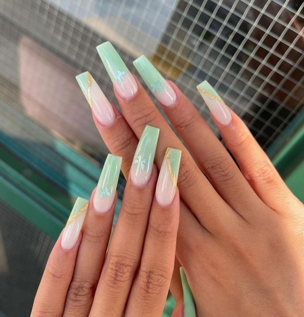 Comparing it to a cool breeze during summer, these square-medium nails look really fresh with a mint green color along with golden foil details and tiny white flowers that symbolize the growing season. They are the perfect combo of fun and delicate, which fits perfectly for a garden party or even a regular day at the office. The look can be completed by a light green scarf or matching accessories.
