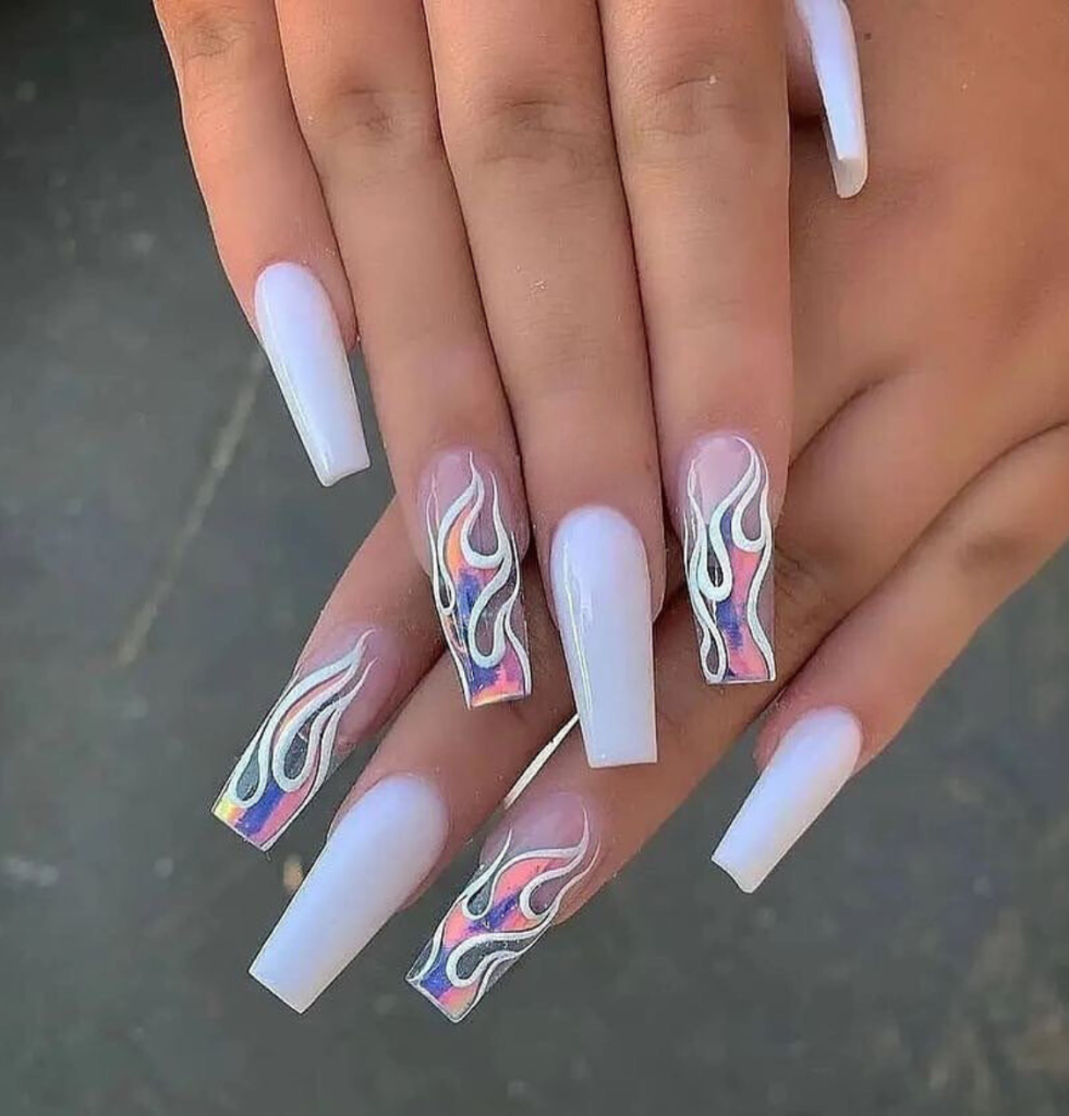 Transport yourself into the retro era with these coffin cut short nails that flaunt swirls of holographic flames on a transparent background. The design is a characteristic one of fun and flair and is absolutely ideal for a free-spirited woman who is going to a summer music festival or just breezing through her day dancing. A tie-dye T-shirt or a retro sundress will boost your outfit to the fullest.
