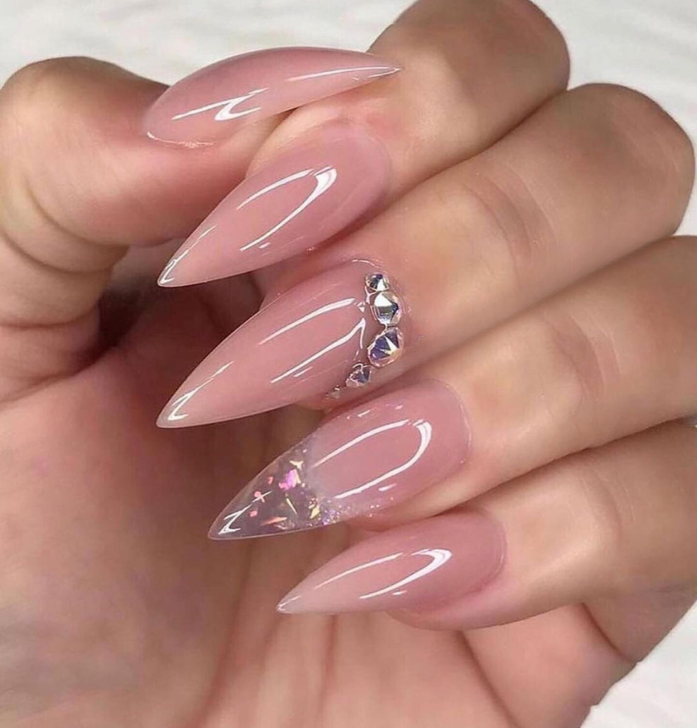 Almond shaped nails are just so chic; with a sheer pink base and a glitz on the ring finger they are the perfect example of high fashion. The design is uncomplicated but still takes your breath away, which is exactly what the minimalist who adores a flicker of shine should wear. These nails, on the other hand, would complement a classy watch or subtle jewelry, and they would be suitable both for a work day and for a night out.