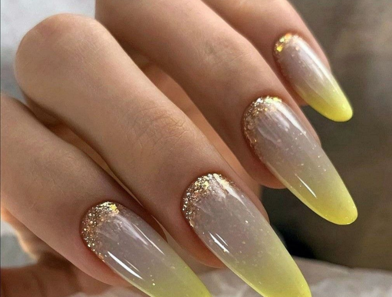 Twilight skies that are soft gradient in color and are captured by the design where the sun meets the coolness of the early evening with the warmth of the setting sun. A very fine mixture of brown at the cuticle provides a transition into a dusky yellow which is the ombre effect that is both discreet and powerful. Barely gold glitter is these nails’ only ornament but they are a reference to the simple and beautiful way of nature presenting its daily show.