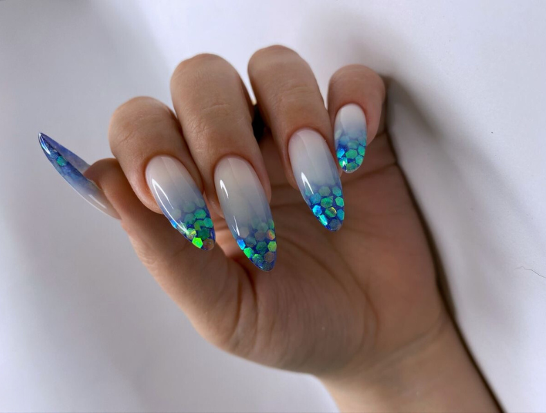 These nails are the ocean’s underwater world full of wonders, and their iridescent purple and blue tips that glimmer like fish tails create a vision of fish swimming in the water. Together with the small single row of colored rhinestone accents, it gives the idea of both the delicate fantasy of mermaids and elegant finishing touches, which is suited to the dreamer who gets inspired by the ocean’s abyss.