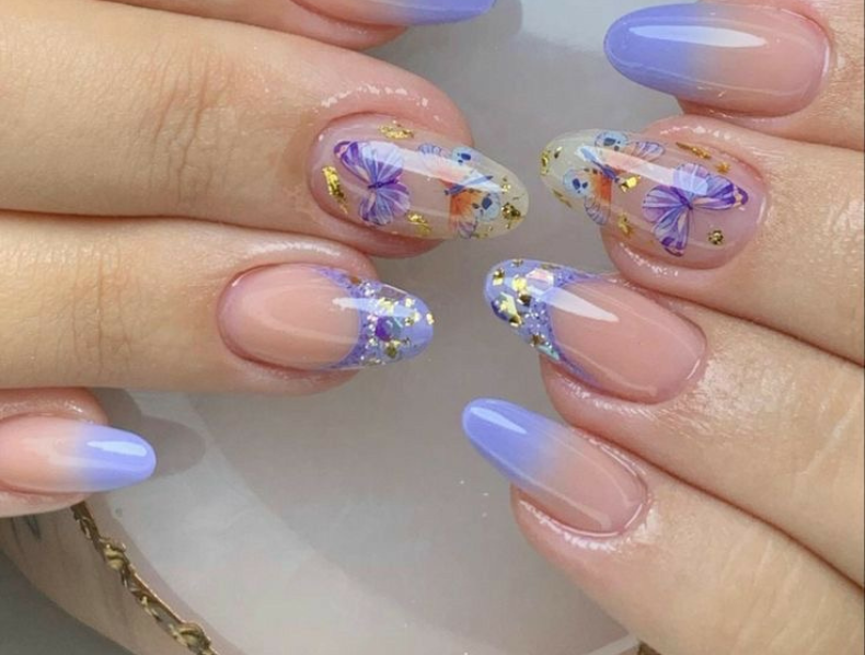 Experience the fragile splendor of sunlight with these nails that are designed with literally tip-transparent butterfly and flower decals. The accents of gold foil give a pronounced feeling of luxury to the light blue and purple colors that resemble a flower garden in bloom. This design reflects the soft buzz of a butterfly’s wings. Only those, who are able to value the small details and the gentle slip of nature, can wear it.