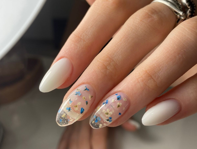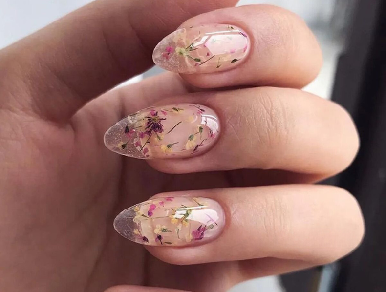 Acrylic encapsulated flowers with dried petals evoke a nostalgic sense of spring on these nails. The pastel color palette not only serves as a surface but also as a claimed state amendment, enhancing the fragile floral tints and making the cybernetic garden at your fingertips blossom fully. This proposal encourages the bearer to be a part of nature and, as such, it is a perfect gift for every charming and feminine person.