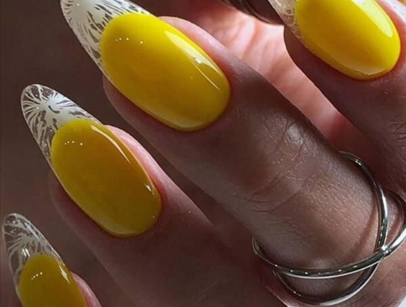 Daring and fully self-assured, these bright yellow nails are nothing but the sunlight on a summery day. The white lace-like patterns on the tips that are added to have a slightly sophisticated touch, which turns these nails into a statement piece for the light and energy woman that you are.