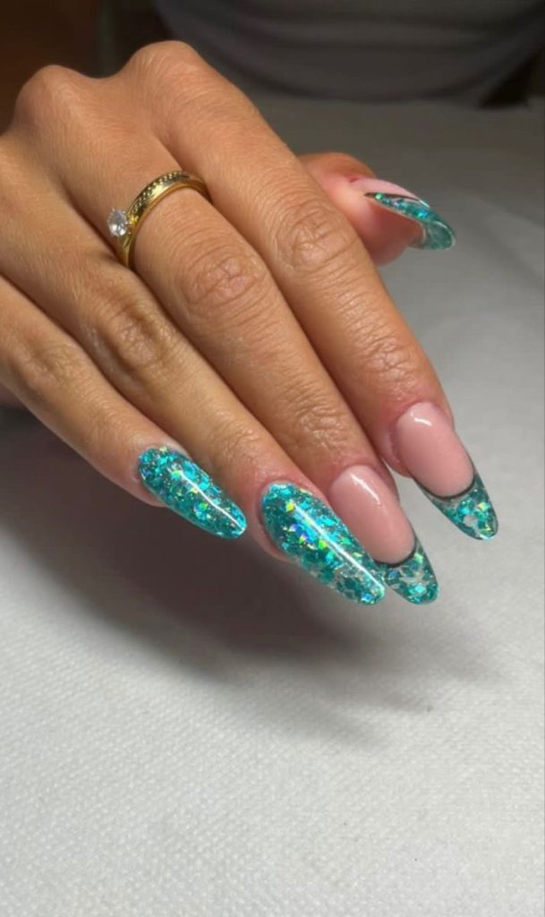 Picture the rhythmic dance of waves with these oceanic-themed nails. A transparent base integrates the light blue of the ocean, which is encrusted with glitter that mimics the shimmery surface of the sea. This graphic design echoes the essence of the ocean, which is -‘ “free, untamed, and beautiful. ” -> поўную