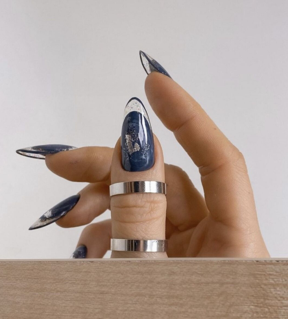 Taking a cue from the iconic Delft blue ceramics, these nails showcase the traditional craftsmanship. The white and blue splatters on the matte top coat create feelings of the complex patterns of the old porcelain, which makes this design a timeless choice for those who want to add a little bit of history and sophistication to their style.