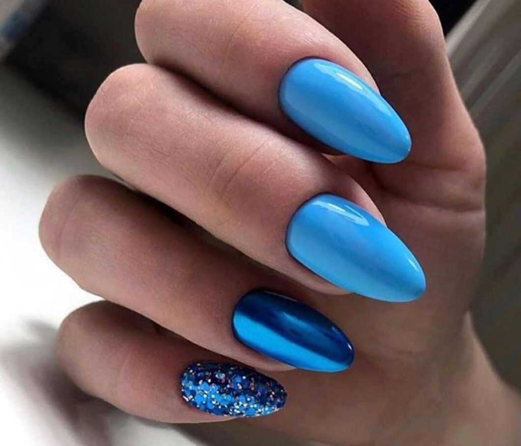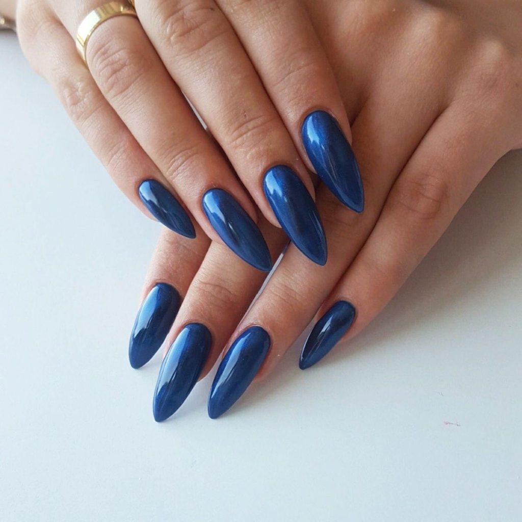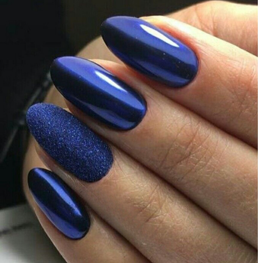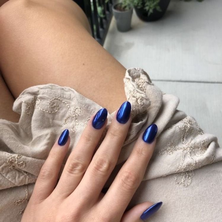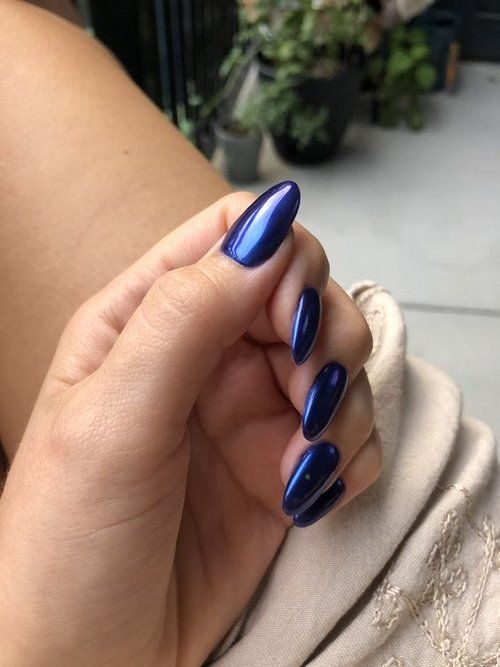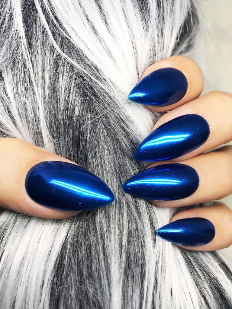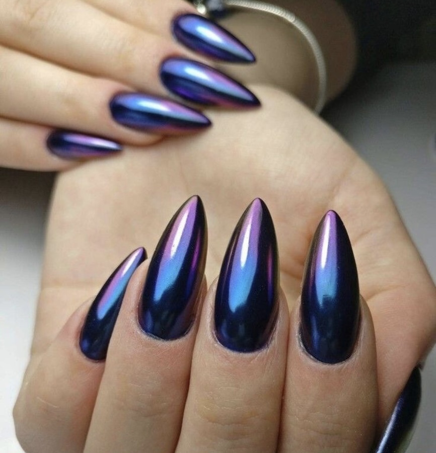 The Indigo blue nails are deep and full of sophistication for women who want to experiment with different nail designs. These nails are in the almond shape which is a great addition to the beauty of your hands. The shiny chrome artwork is a perfect base for all combinations of colors and it also highlights every ray of light. Women who love combinations of classic and modern styles can select it.