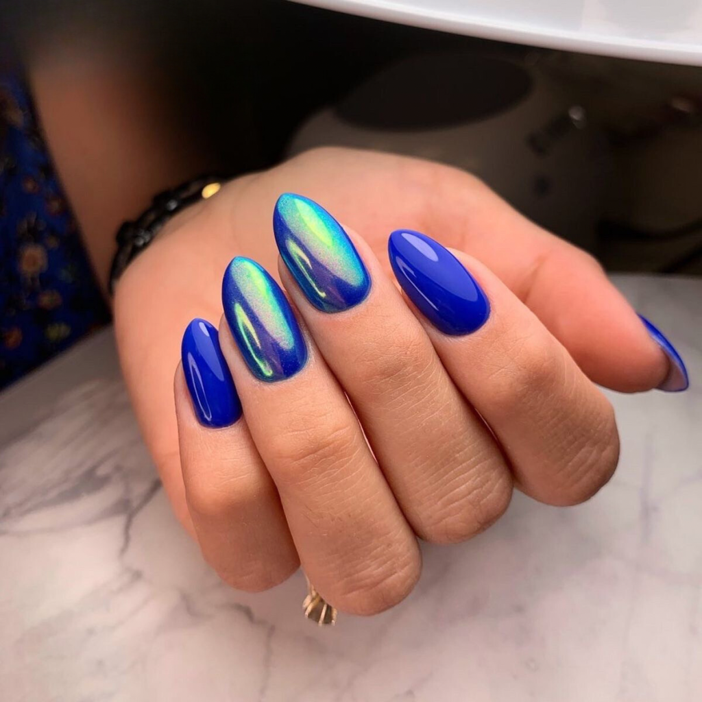 The electric blue chrome nails are not only eye-catching but also in fashion. Being in the classic oval shape, the electric blue shades give a lively touch to the nails which is ideal for adding a bright look that is easily recognizable. The chrome finish, being reflective, makes it suitable for wearing them at night, thus, introducing the element of space age glamor. The streamlined oval form not only is the representative of the feminine factor but also is the counterbalance of the color bravery. Additionally, you can mix the designs like glitter overlays and subtle patterns in order to achieve a personalized and distinctive effect beyond the blue chrome trend.