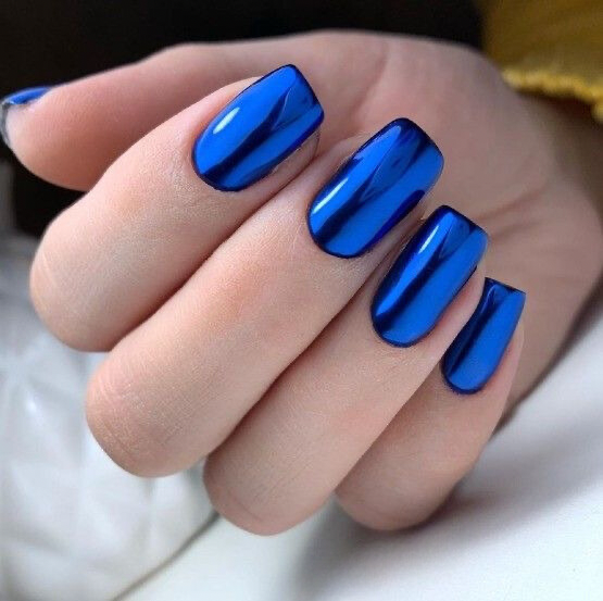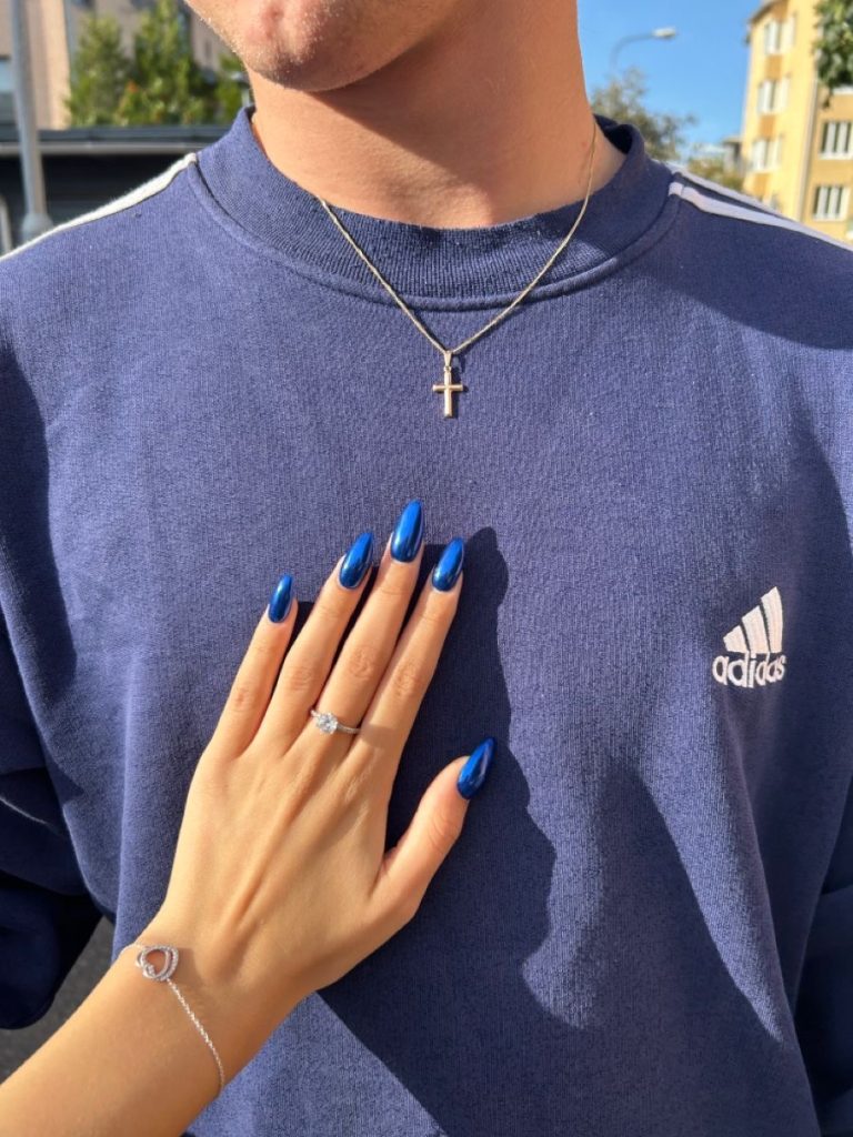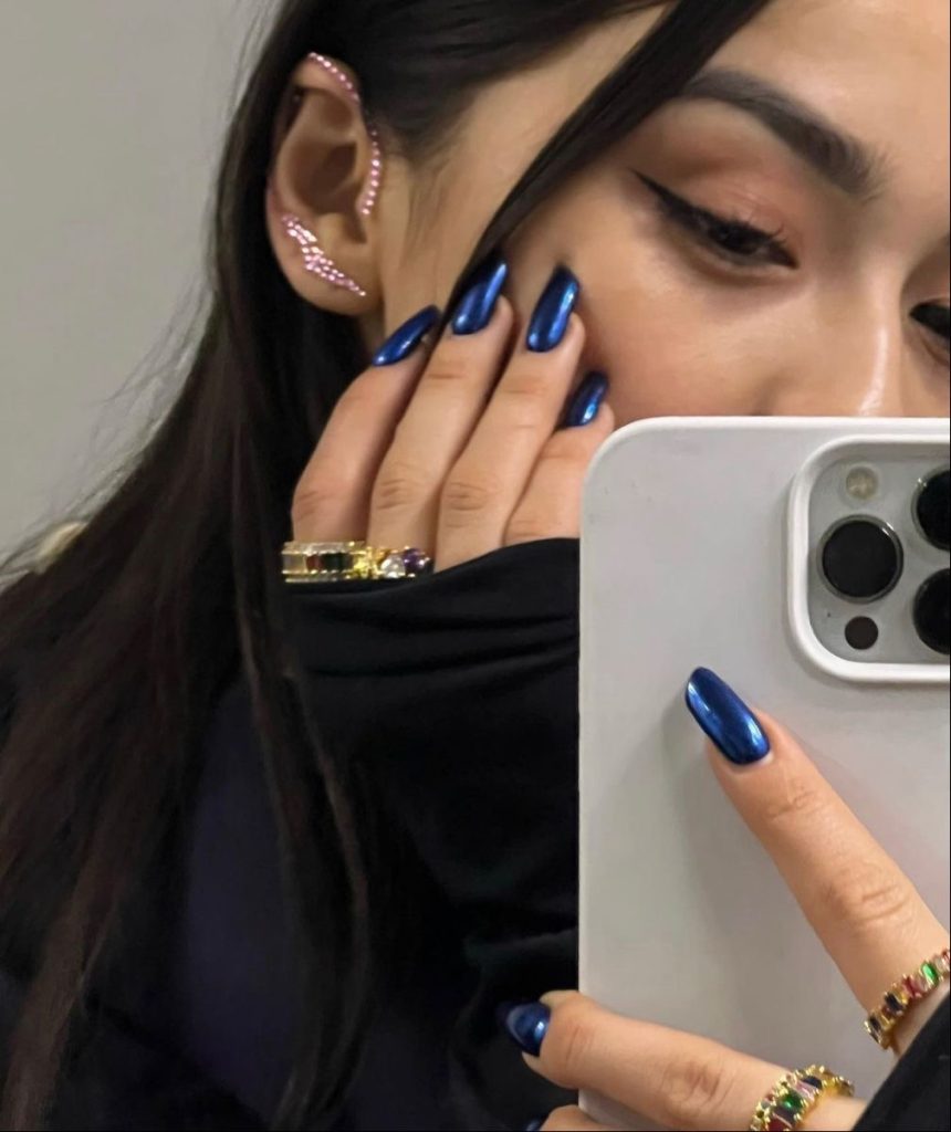 Blue chrome nails, with their nighttime glimmer, are more than just nail accessories—they also sport a laid-back coolness that can easily suit wearing them during daytime. These nails, teamed with a chic and loose athletic pullover, demonstrate that royal blue can be as suitable for a relaxed Saturday as it is for a night on the town, thus proving that fashion is free from limitations.