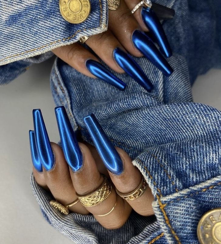 Picture this: the classic American fabric reimagined at your fingertips; this is the vibrant blue chrome design. Paired with your favorite denim jacket, these nails showcase the confidence of a modern woman with a brilliant, electric blue color. They are the daring coffin shape that bespeak the spirit of adventure that denim has always represented, plus you can express yourself just as much with a model that has an added attitude.