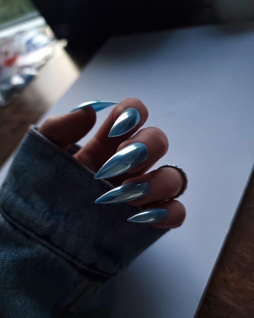 The blue chrome future of our next image is represented by a positively unbelievable icing blue shade that seems to have been manufactured from liquid metal. The coffin nail type is indicative of the boldness and the first-to-think attitude. It is indeed a design that looks to be from a science fantasy setting, however, it is indeed here, in 2024, ready to assert the wearer’s highly innovative spirit.