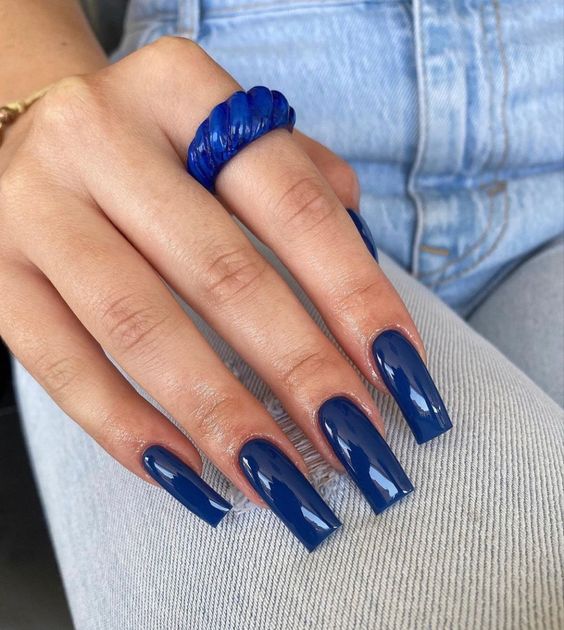The merge of style and modernity can be found here and it is like a piece of art. Complementing the urban atmosphere, these trendy air force blue nails are the perfect example of metropolitan chic. The reflection of neon blue on their surface is as eye-catching as the neon lights of a busy city with no other than, these nails as the ideal jewelry for a cosmopolitan woman who is as full of life as the city she dwells in.