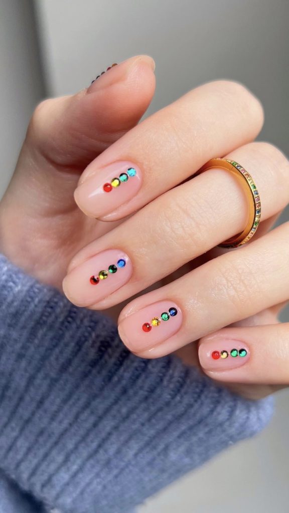 The nails look like a rainbow capturing the moment of a spring shower. A blue, nameless lightweight sparkle, bringing the golden hues of a delicate ring, it is an imaginative design with multicolored gems sticking in a rainbow pattern on a clear gel base. This is a designer style that mixes gaiety with elegance and is perfect for those who like to be a bit whimsical while dressing every day.