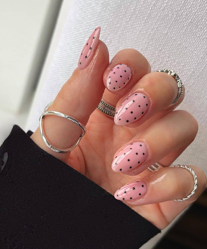 Polka dots are always in fashion. When they are teamed up with a base color of soft pink, they are able to establish a playful yet cute and simple look. This nail design is ideal for giving your outfit a fun touch, be it for work or a casual lunch.