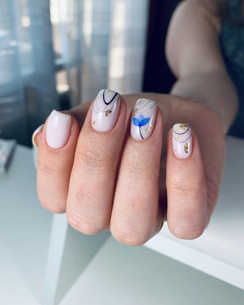 The combination of artistic design and nature has resulted in the great creative originality. A simple yet abstract marbled appearance coupled with fragile plant drawings and gold flake ornaments makes it possible to create a nail art model that is not only simple and sophisticated but also modern, appropriate for the spirit of a true artist.