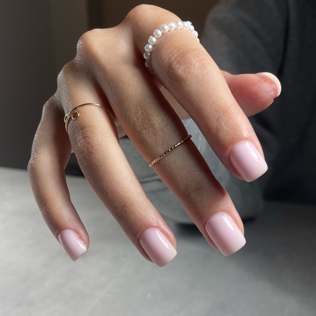 The soft pink tones have the main role in this simple yet elite design. The square nails have a covering of a soft pink color that perfectly contrasts the fragile rings, thus it can be worn for both daylight and evening.