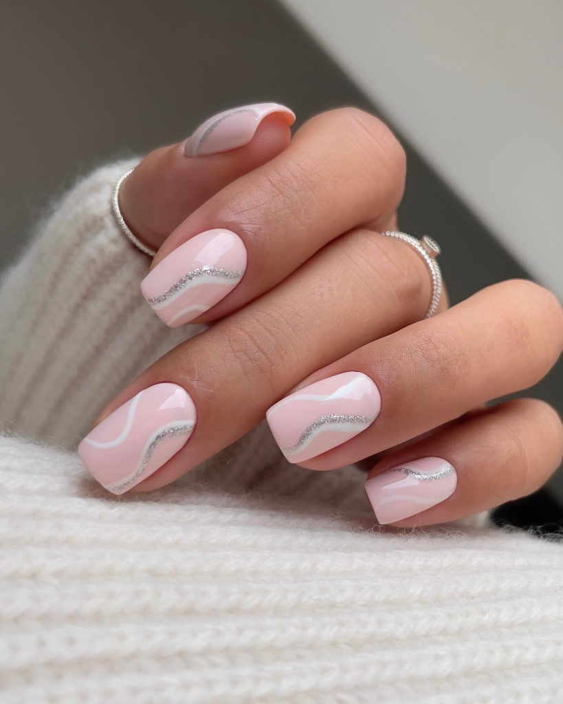 Sporting a creamy pink base decorated with a white and silver glitter swirl, the last design exudes elegance and catches the attention of everyone. Instead of the usual French manicure, this design presents a very modern touch, with a bit of fun that is very characteristic to it while it still keeps a refined air.