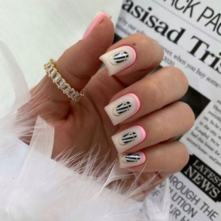 Safari is the leading theme for this design which is a playful take on the idea. Short, almond-shaped nails lacquered in pastel colors look like they are wearing a bold zebra fine lines. In this way, you can rock a wild pattern in a cute and modern way, thus showing your adventurous but at the same time your earthly side. Summer 2024 is a great time for this.
