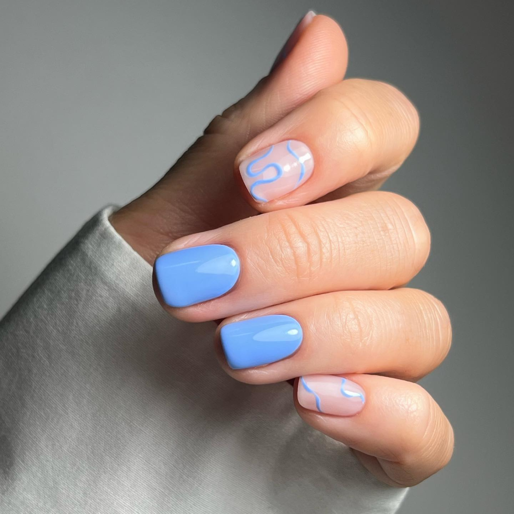 Immerse yourself in the peacefulness of the summer sky with these blue nails that encapsulate the idyllic of a bright sunny day. The short almond shape enhances the modern twist while the delicate white swirls bring elegance. This design is for a woman who is able to observe summer as a peaceful and meditative time, that she can spend as a secluded retreat from the rest of her usual busy life.