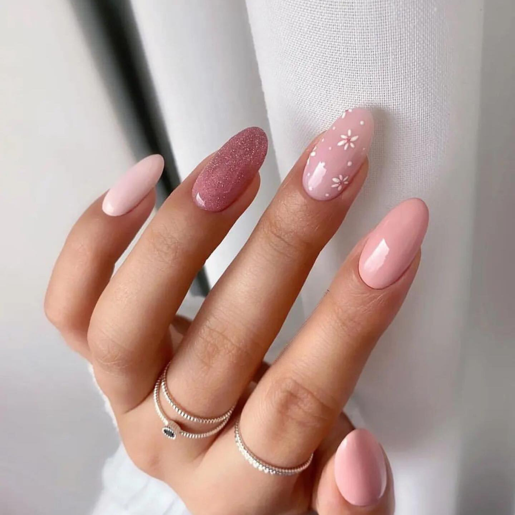 Capture the essence of summer garden with these nails that mix the warm pink with the white floral accents, thus creating a design that is cute and classy at the same time. The almond shape gives off an air of elegance, while the glittery detail lightens up the whole image. This nail art design is a perfect choice for the woman who celebrates her femininity and the wonderful blooming season of summer.