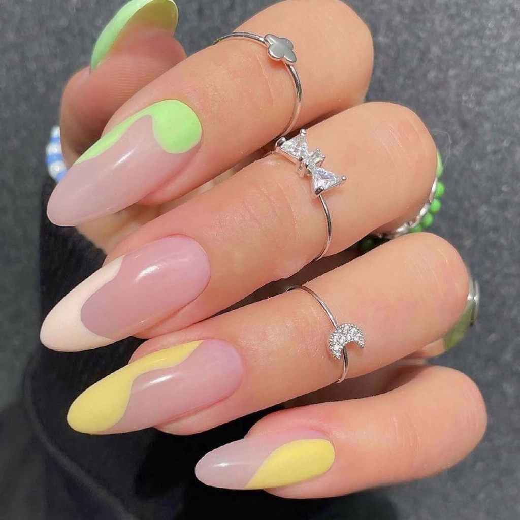 The vivid juxtaposition of citrus colors against a soft background is a true summer marker. These nails feature a sheer pink color and a short almond shape, but that’s not the whole story. The tips of the nails with bright yellow and a touch of neon green at the cuticle are watermelons, the summer fruit that brings coolness to our minds, thus, these nails are бы.