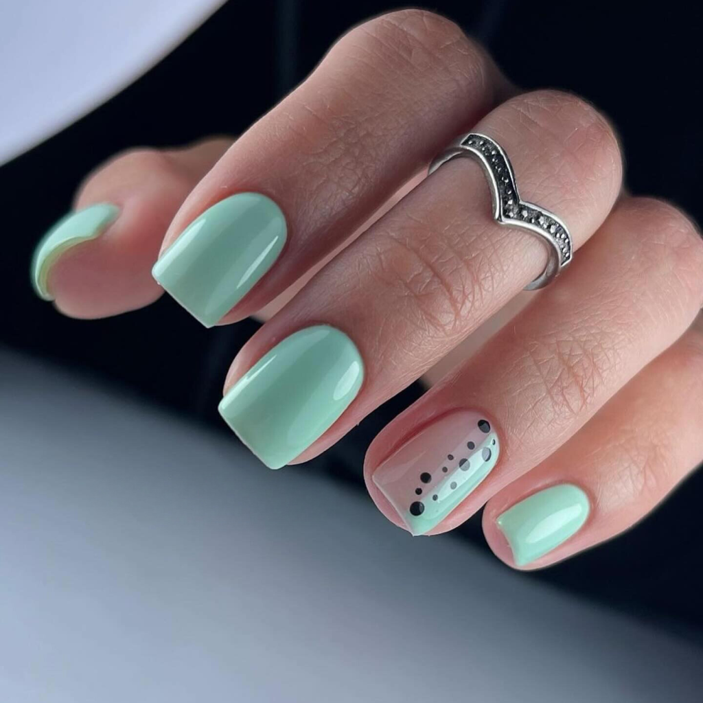 Like a mint sorbet, these short convex nails with the cool green color are refreshing. Along with just one accent nail, which is a playful line of polka dots, this design fits a woman who loves life’s little pleasures, and she is not afraid to mix in some fun and fancy things in her days.