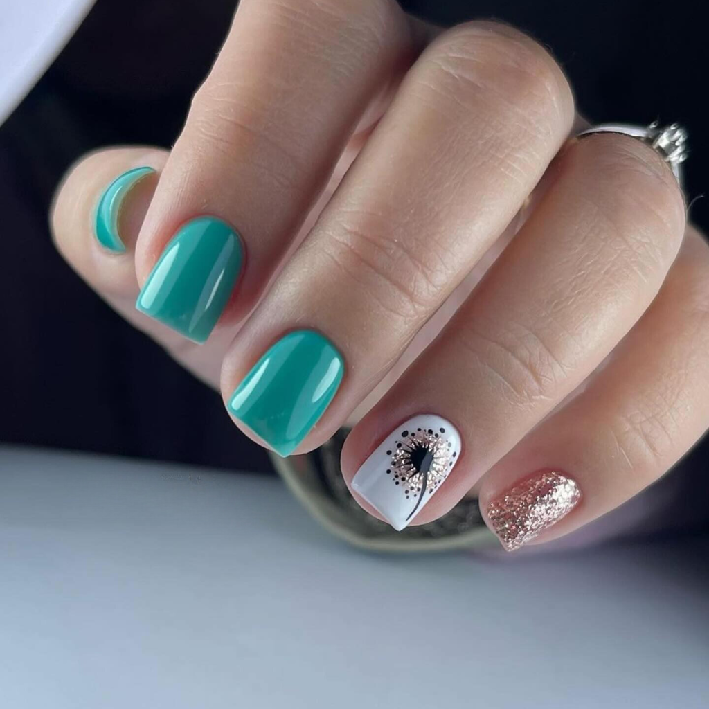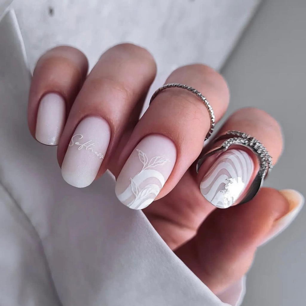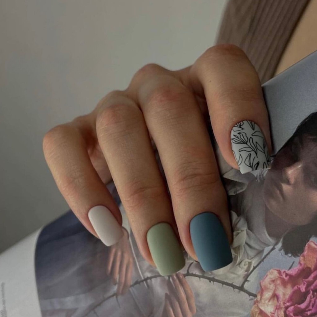The gentle gradient of white to soft greens and blues reminds the reader of a monochromatic elegance. The presence of a solitary nail with a brachyphylla pattern of very simple leaf decoration demonstrates that nature can be one´s companion anywhere on earth. The feature of the nails being short and in a matte texture has a breezy modernity to it that is why it is a favorite of the true fashionista.