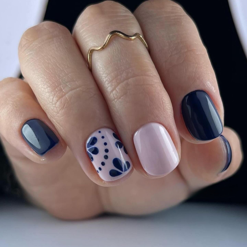 Beneath the light of blue and pink here, a blend of nautical and feminine tones is brought. The short, square nails are used as a blank canvas for the simple yet brilliant swapping of hues, whereas the patterned accent nail is a vehicle of creativity for the design. This design has the voice of the fun and sophisticated summer and is perfect for those who like to tell a story through their nails.