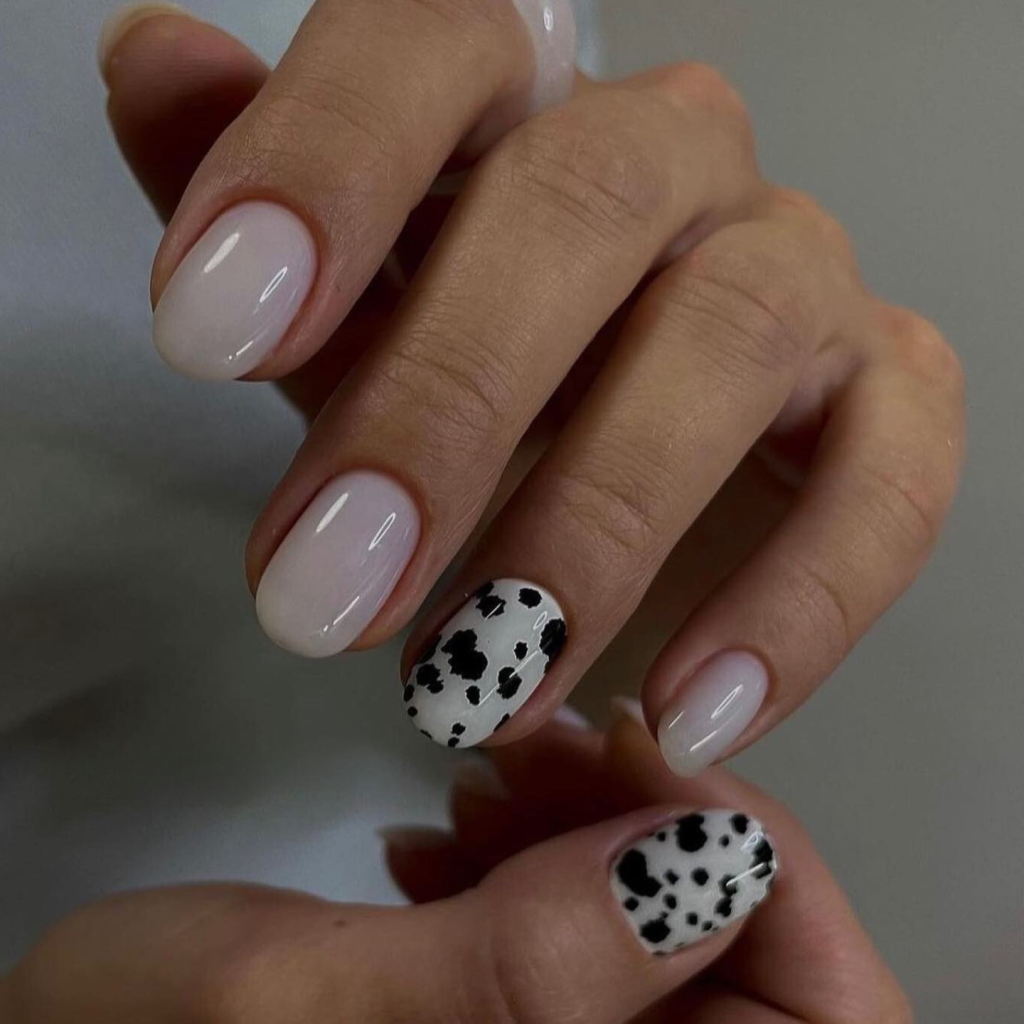 These short nails with a white and black spotted design are for the woman who appreciates a balance of fun and sophistication. The spotted pattern adds a playful angle to the minimally pink base, which is perfect for those summer days when one should add a little fancifulness.