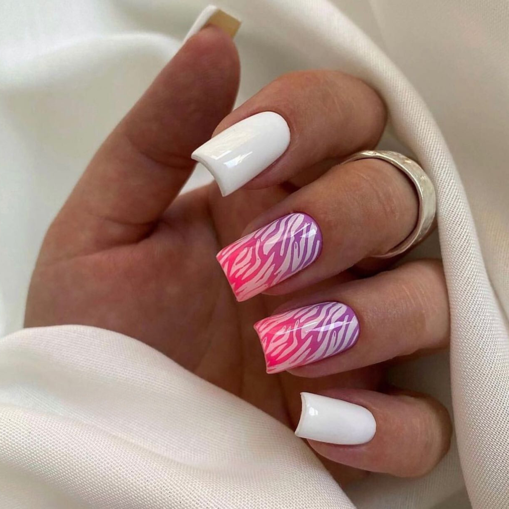 This white nails embody zebra stripe patterns beyond the pink gradient combo, wild patterns, and feminine soft. The almond form brings a contemporary vibe, which is why it is a simple statement but is sure to catch the eyes of all in the summer of 2024.