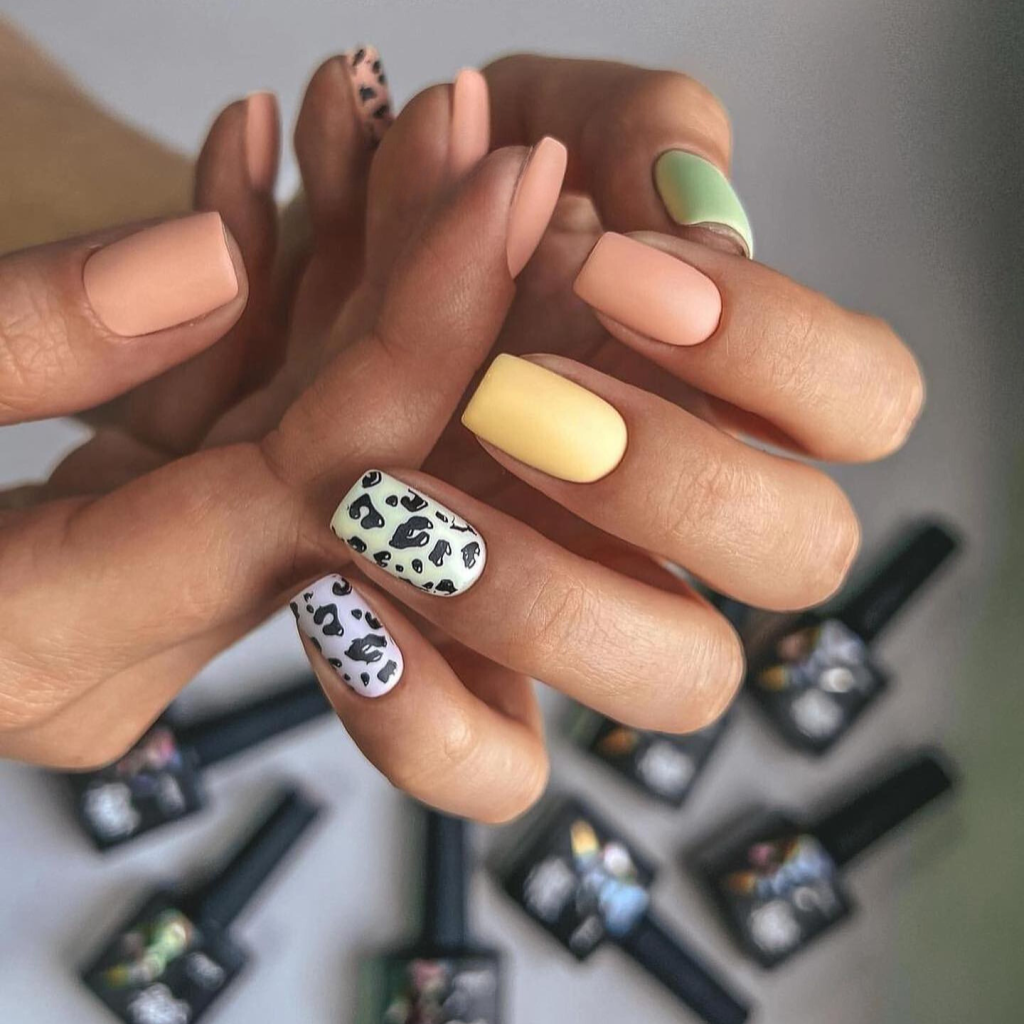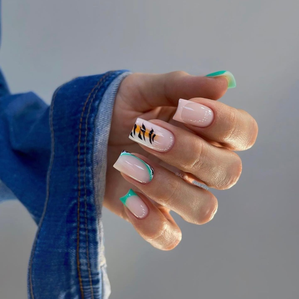 With its fierce tiger stripe design juxtaposed with white and pastel colors, it creates an edgy yet cute look. This straightforward but bold design on short nails is the best symbol of a wild side, perfect for daring people to wear it in the summer.