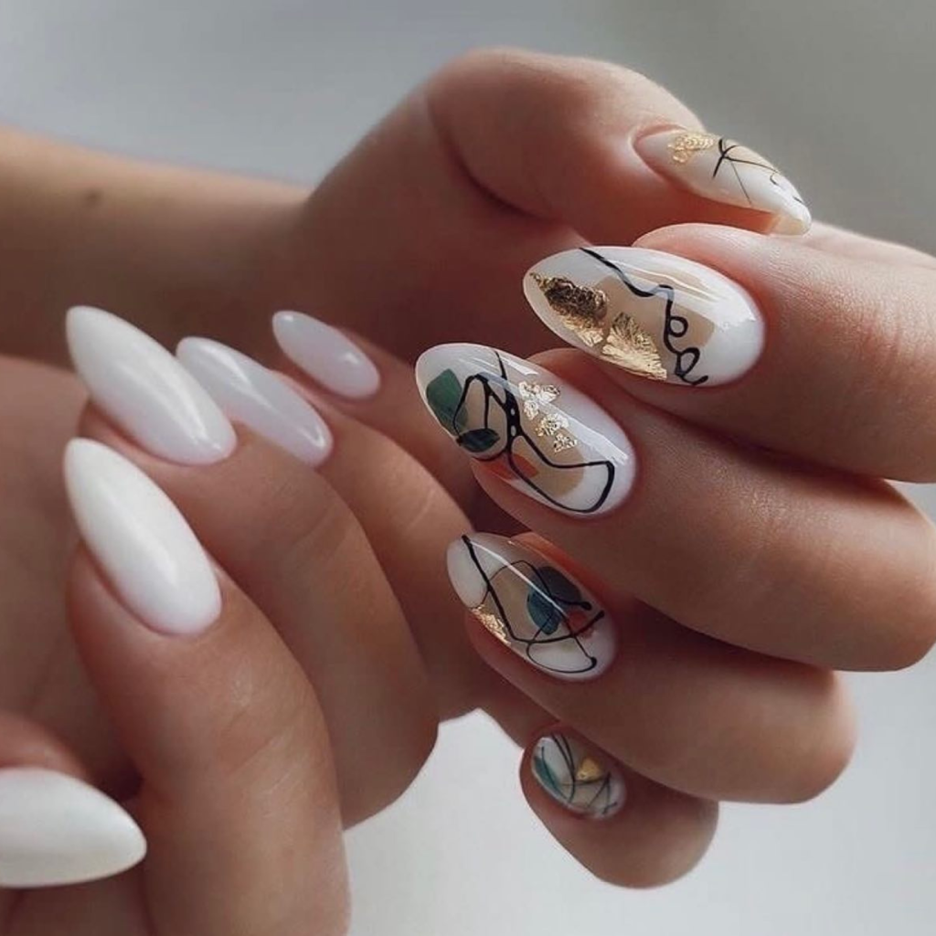 The set stands out as a brilliant example of abstract art. The nails have been used as a canvas for a design that showcases dreamy lines and shapes and is complemented by lovely gold leaf accents. This artwork represents the boundless imagination that can be demonstrated through the art ofnails, which is ideal for people who consider their style to be a personal expression of themselves.