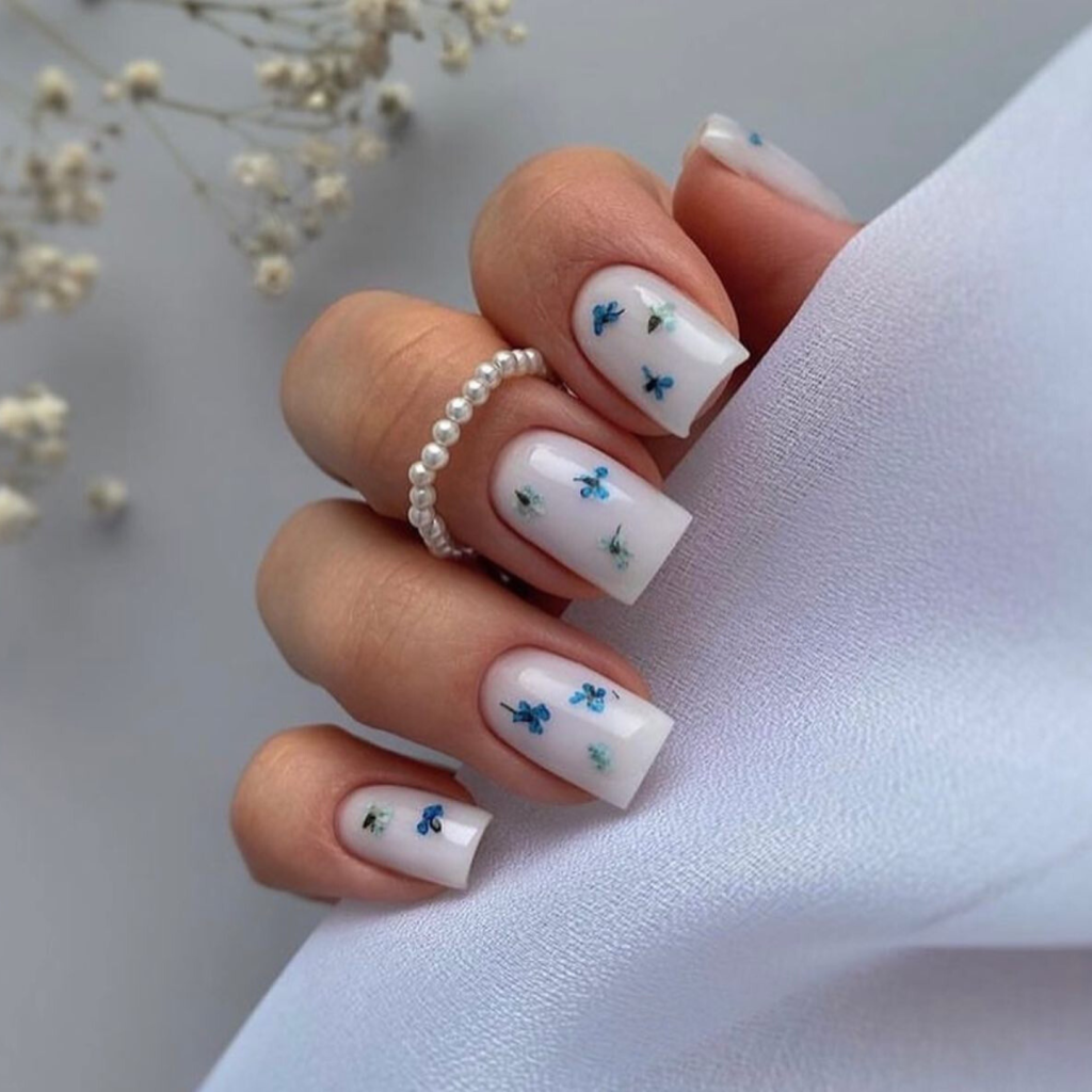 Representing the clear sky in summer, these nails are decorated with little blue butterflies that give a sense of lightness and freedom. The white base that is simple creates the illusion of the cute insects flying, thus designing a calm and playful look.