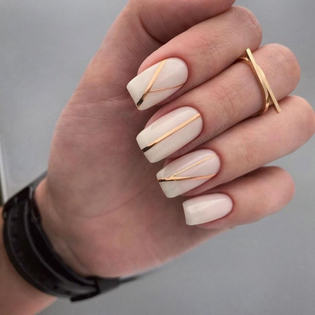 The short nails, detailed with clean lines and simple geometric patterns, get their high fashion touch from the addition of gold. The design not only expresses the classy and sophisticSummer feeling, but also does the blending of minimalism with a fancy hint at the same time.