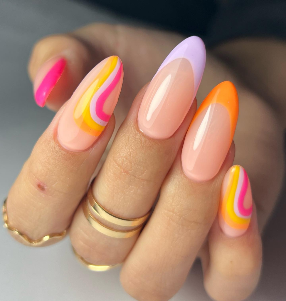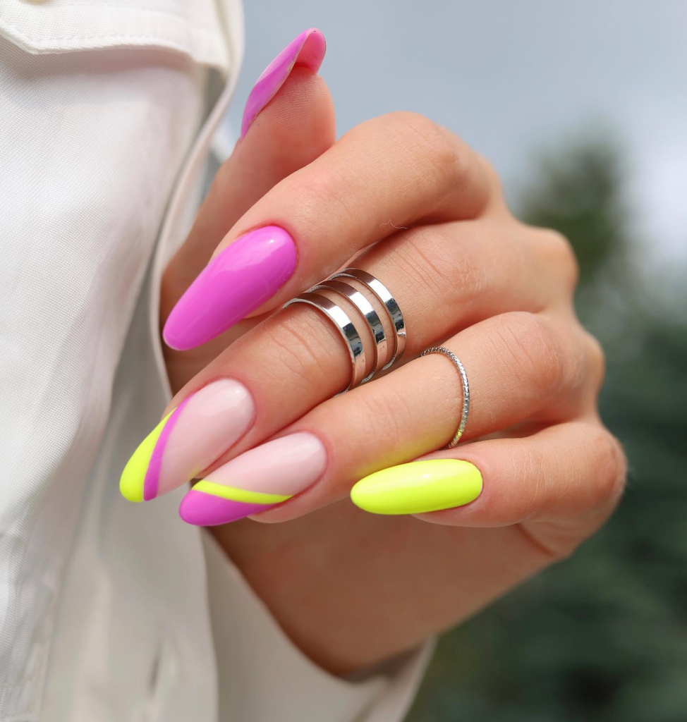 Summer fun is the only idea you will have with these nails. What a combination of electric neon nail edges and a bold pink statement nail. Chic and audacious indeed this style looks with the addition of natural nude colors. The collection presents the almond nail trend for 2024, the ideal design for the cheerful festival season or the beach holiday where disclosing your body is part of the program.