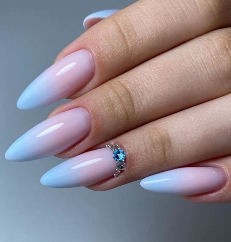 A continuous change from sky blue of the universe to soft milk white, the full and the only truely abstract design of almond-shaped nails. One single big gem in the middle is the blade of the design which is this nail set that reflects the look of a star in a sky at night. These are dual-colored lacquers that are a practical choice. They can be worn at work or at a romantic dinner outside.”