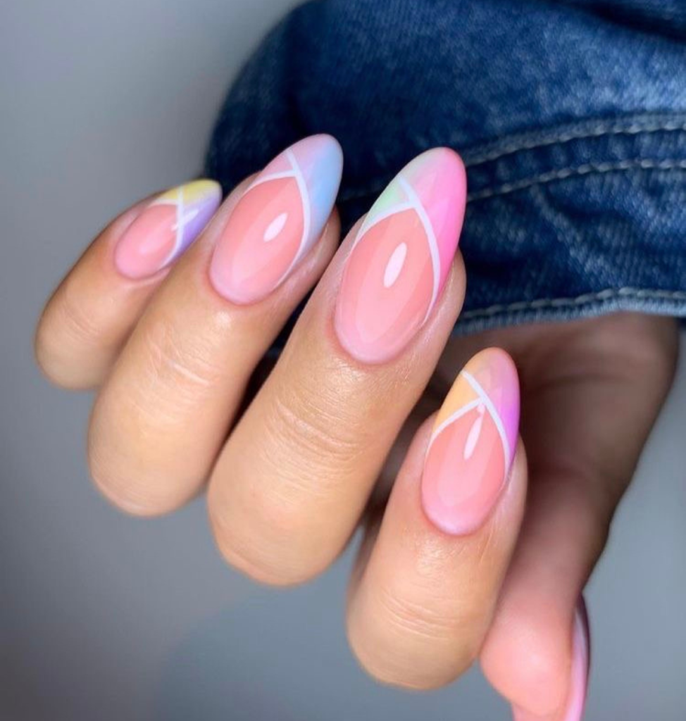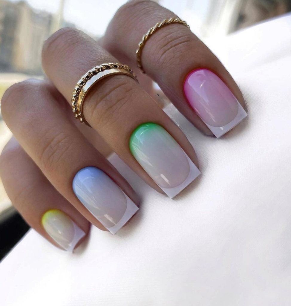 This pattern is just like a French manual but contemporary-style. Each nail features the color palette, which is a succession of gentle shades from the enjoyable french tips to a shocking contrast of color at the base. The square form of the nails is their blank page, light and colors created artistic composition, thus this is a simple, fashionable, and summer occasion choice.