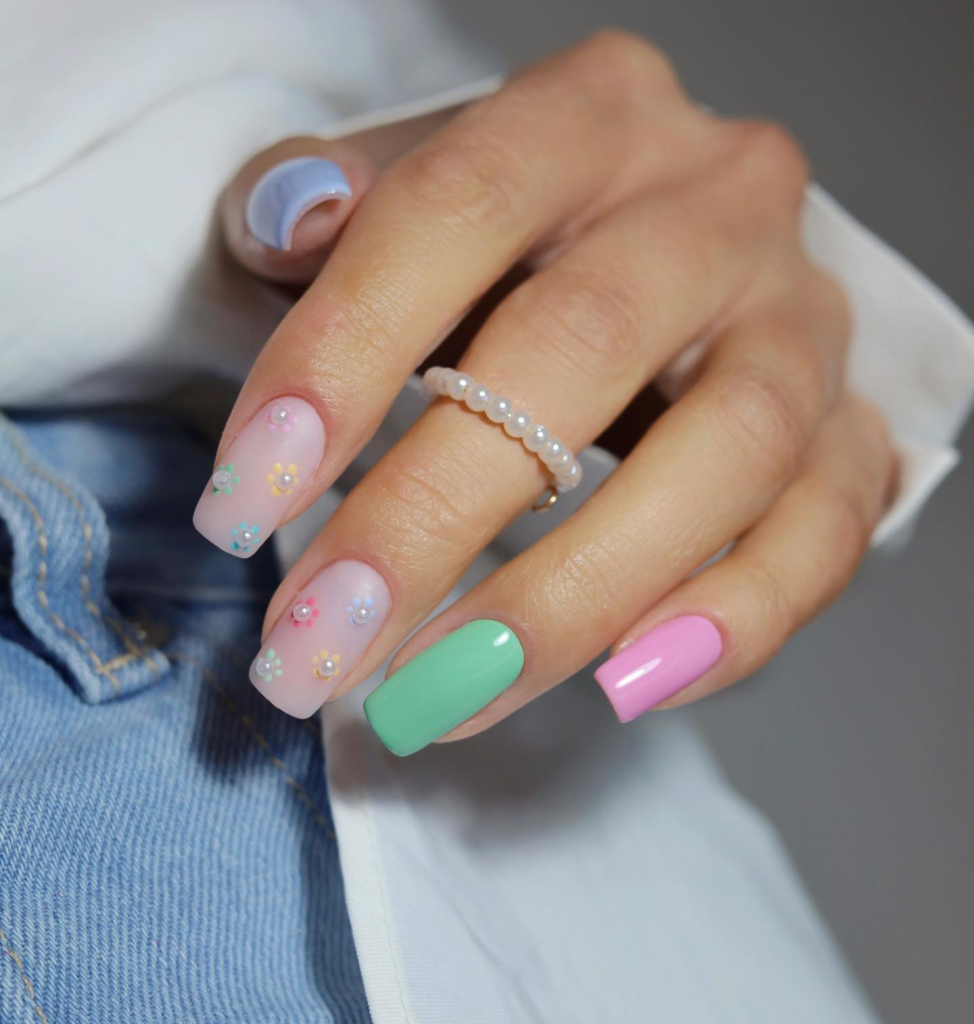 Delicate shades of pink and blue mixed with soft light accomplish a transparent canvas for primary floral accents. These modest designs mimic a flowering mountain, thus giving a light fresh breeze and a piece of nature’s grace. The difference in nail shape from square to oval, and ultra minimalist art, make it so this style is useful in getting both a casual day out or sitting at a high-end restaurant.