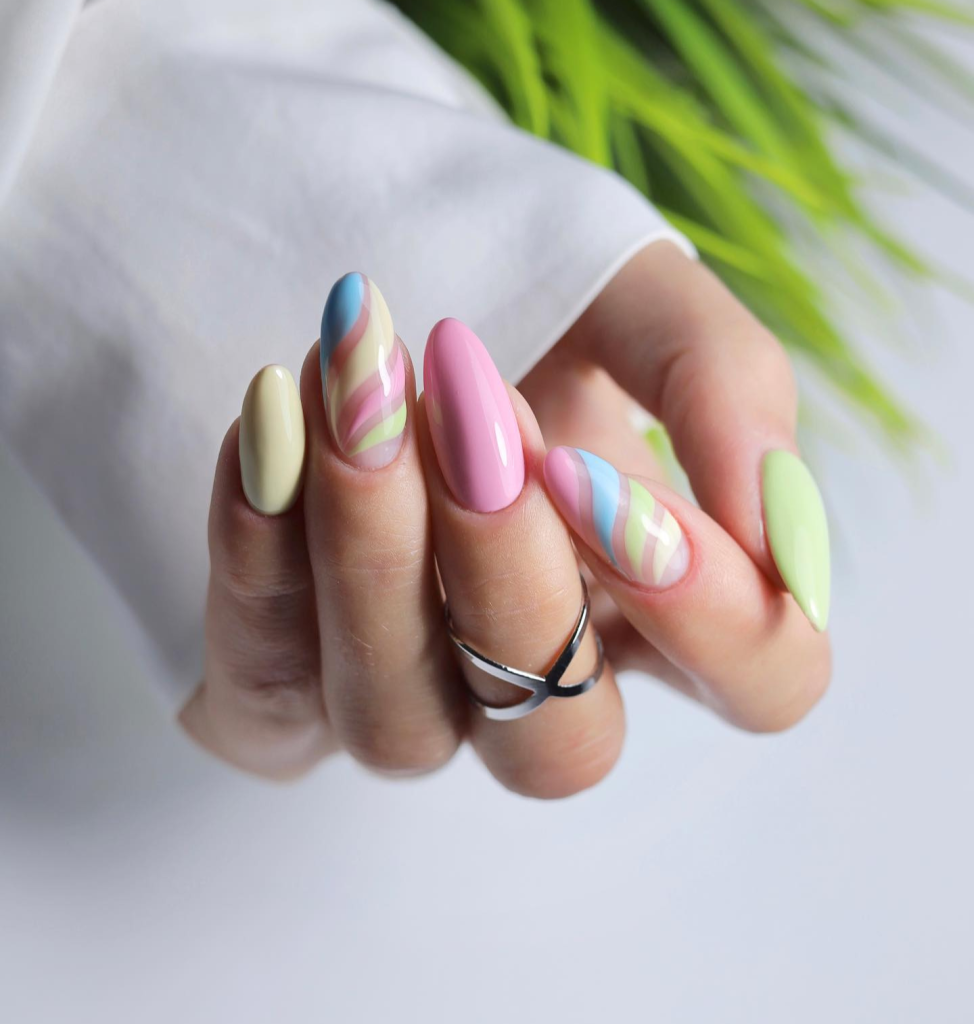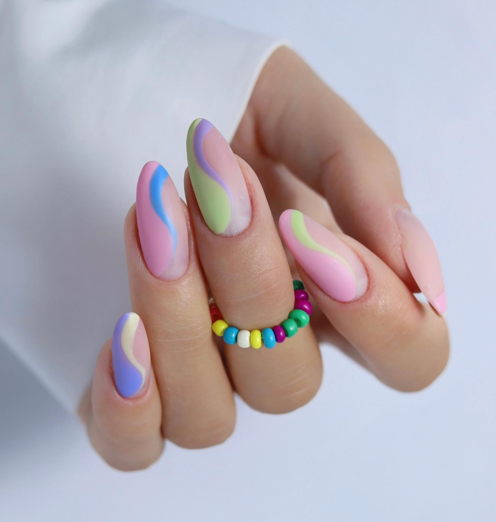 Let these fantasy pastel waves carry you to the summer. The delicately blended pink, blue, and green colors on the opaque base give an impression of a soft wind on a warm day that represents the sea. The scheme, which is composed of basic lines and elegant colors, suits a woman who is the epitome of summer: cheerful, vibrant, and brimming with happiness.