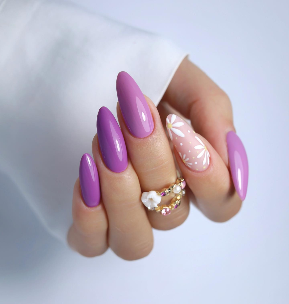 What I am saying is that this nail design completely represents the essence of lavender fields. This design is both chic and simple with the combination of bold purple hues and a single accent nail decorated with sweet white flowers on a pink base that is so tender. Definitely, the almond form of the nails makes the design more feminine and matches well with the playful summer dress and elegant evening gown.