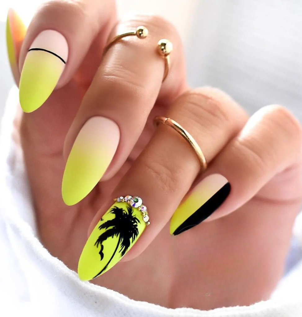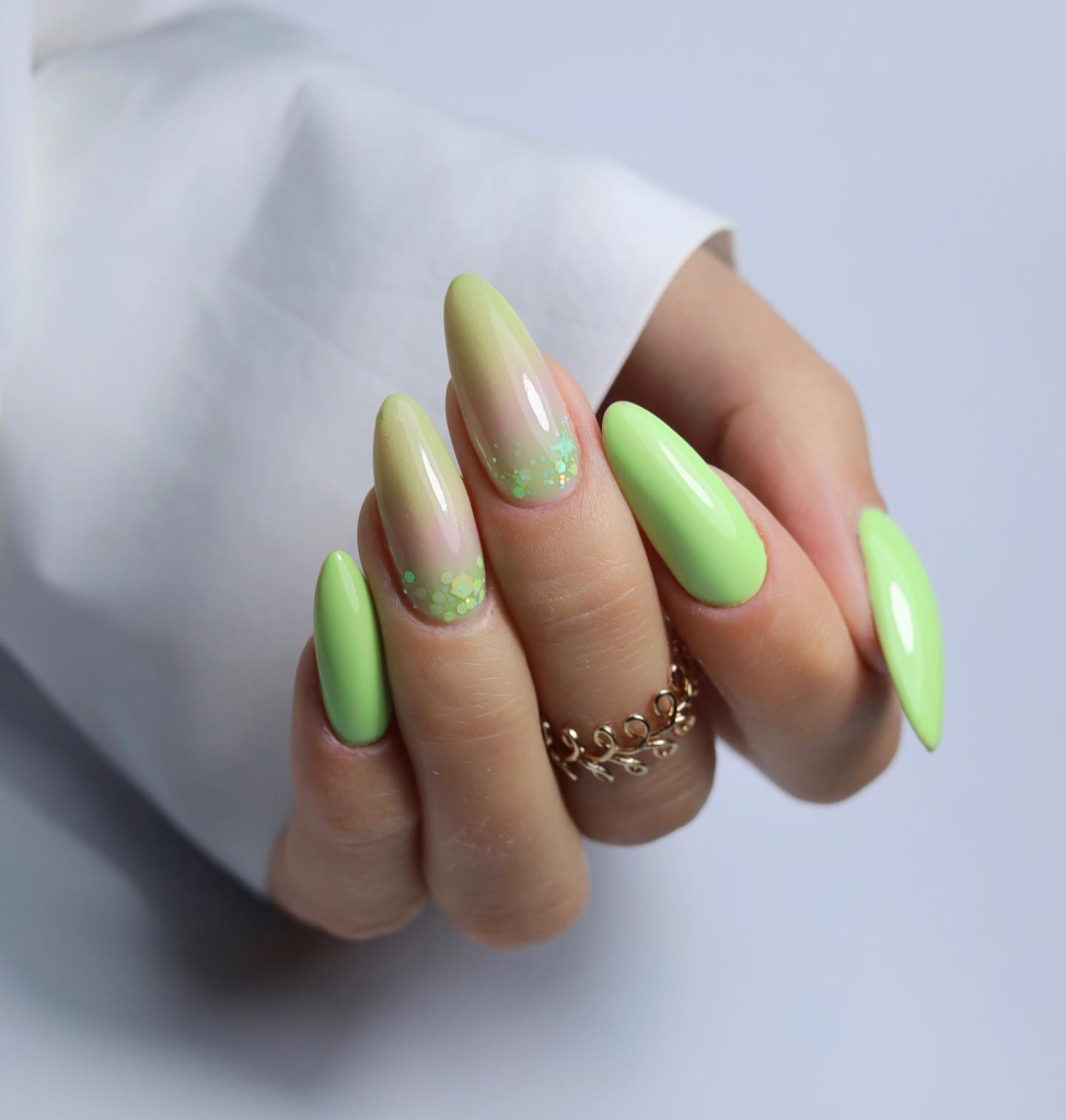 This lively green ombre pattern gives an outburst of freshness. The shift from creamy yellow to lively green evokes the idea of a citrus fruit, which is the good one for a summer day. A few glitters scattered about the design make it look glamorous, while it is simple and design chic. These nails combine stunning shades and are suitable for various occasions, such as a day at the beach or a casual brunch with friends, thus turning any simple casual outfit into a pop of color.