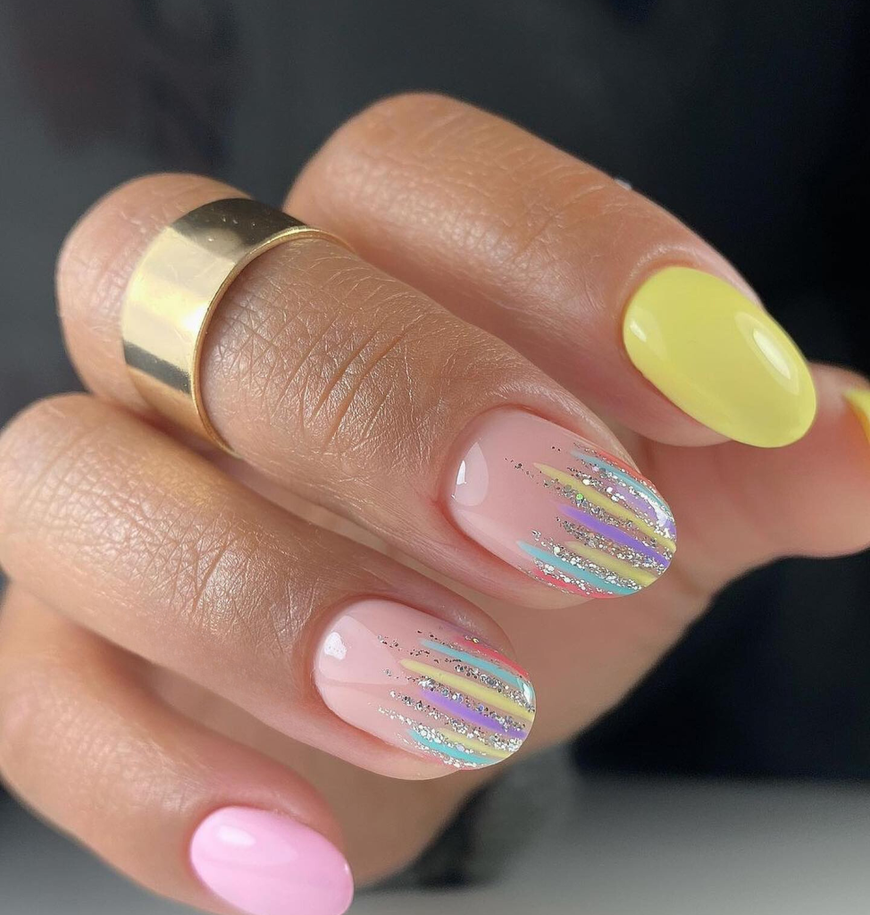 These nails are for you if you want to radiate sunshine in the summer. They are sporting a bold yellow tip and a transparent base on which multicolored glitter is sprinkled. This design is the very essence of the summer vibe with its bright hues and glitter at your fingertips. These are the best to wear to a summer festival or a night party clinging to these nails that will shine as brightly as you do.