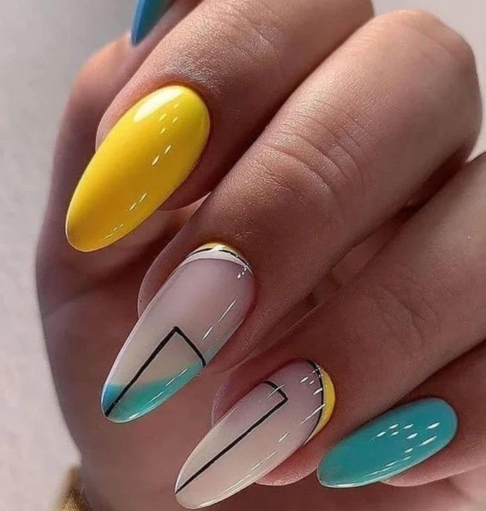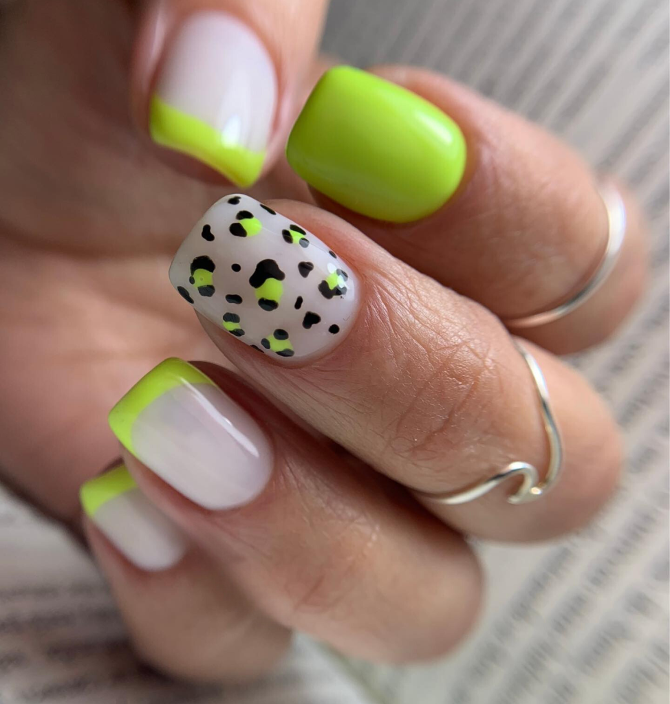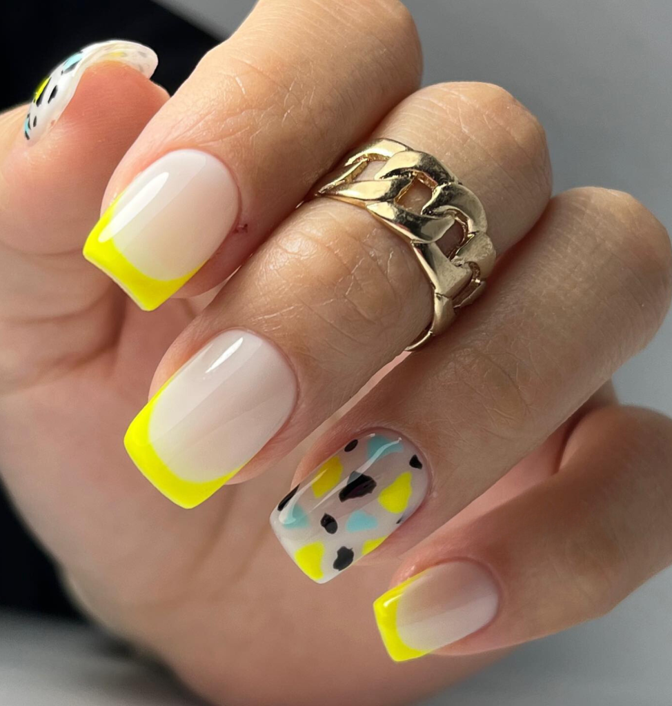 This eye-catching design is designed with short nails and a playful spin on the classic French manicure. The neon yellow tips are bright and clunky comfort for a summer day and night. An abstract single nail pattern with blue and black shapes is totally different and respite away from a typical style. A casual style, worn equally to a poolside party or a summer festival, creates this look.
