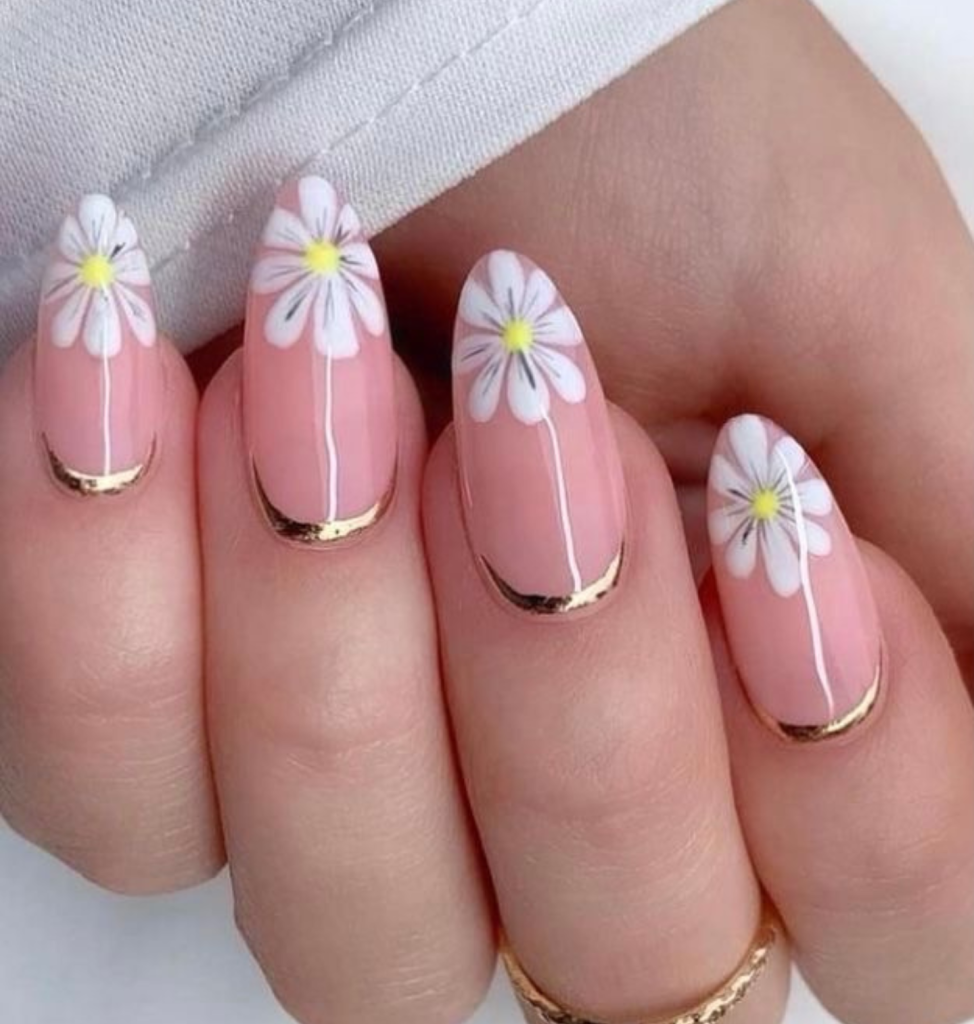 Living summer gardens are characterized by these natural nails colloquially decorated with delicate daisies. The soft pink base is the embodiment of womanhood, while the tips with golden accents add a touch of elegance. The unpretentious flower motif is a classic way to look chic, suitable for a marriage in summer or a casual walk around the town.